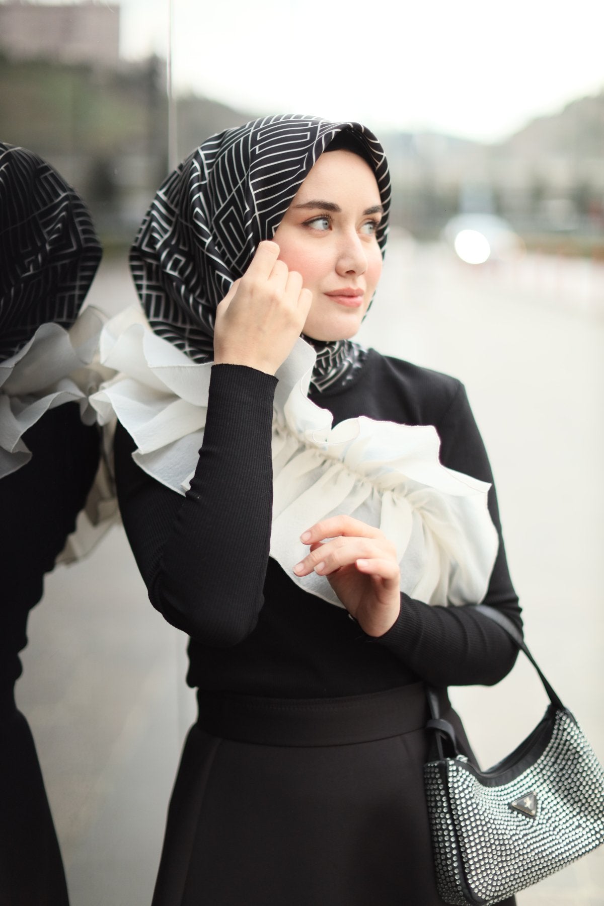 Ce design moderne de Silk Home présente des motifs géométriques sur un fond noir audacieux, offrant un style saisissant et contemporain. Ce motif répétitif apporte une touche dynamique et élégante à toutes vos tenues.