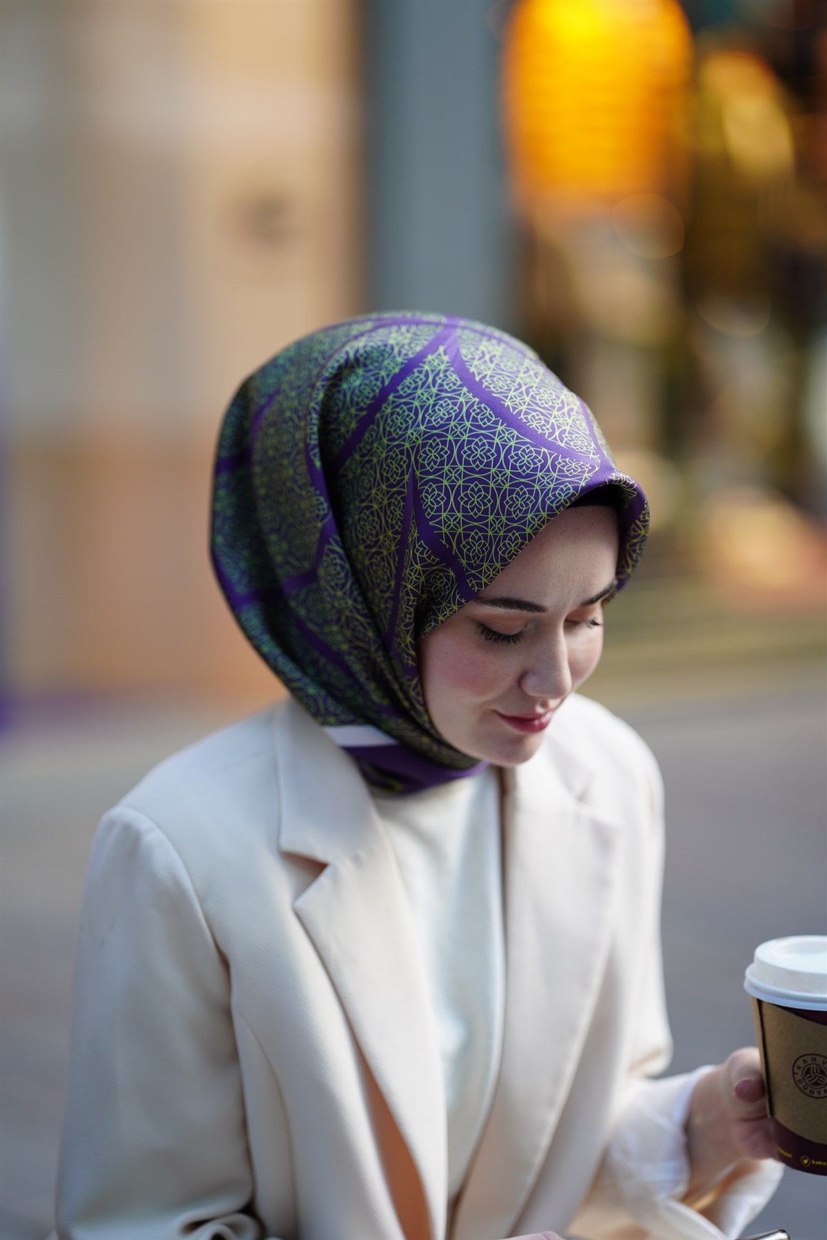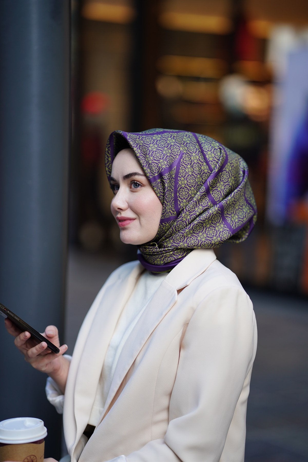 This special design from Silk Home offers a sophisticated look with its blend of lilac and olive green tones. The contrasting green border along the frame adds a unique character to the scarf.