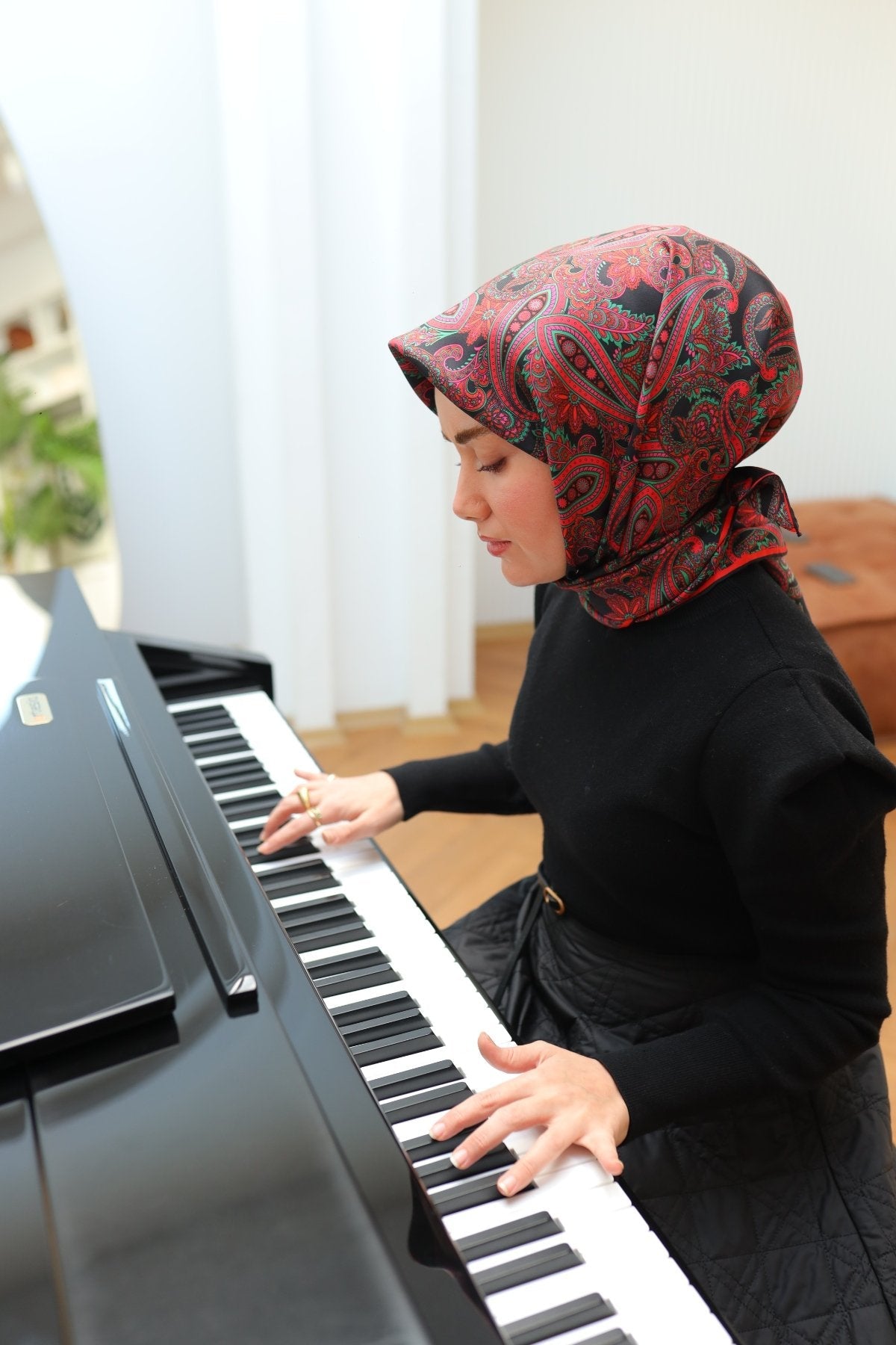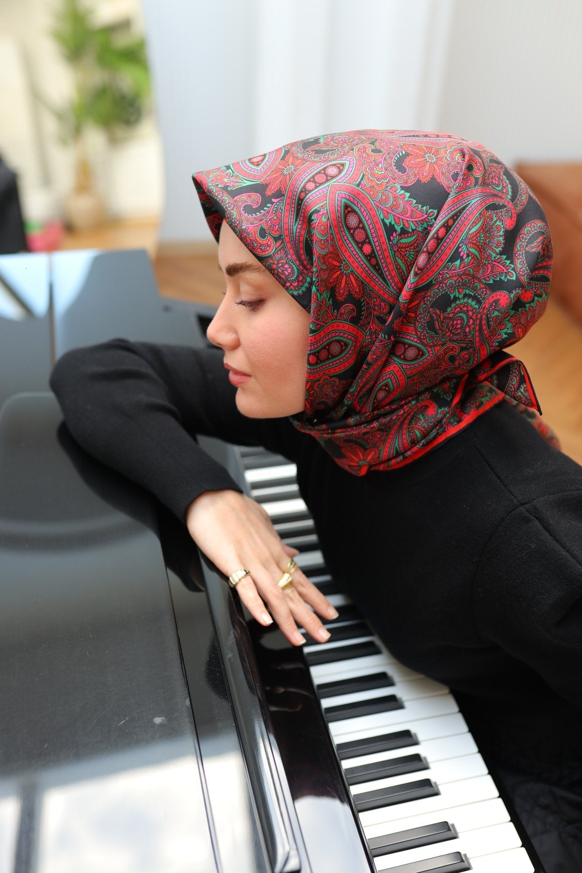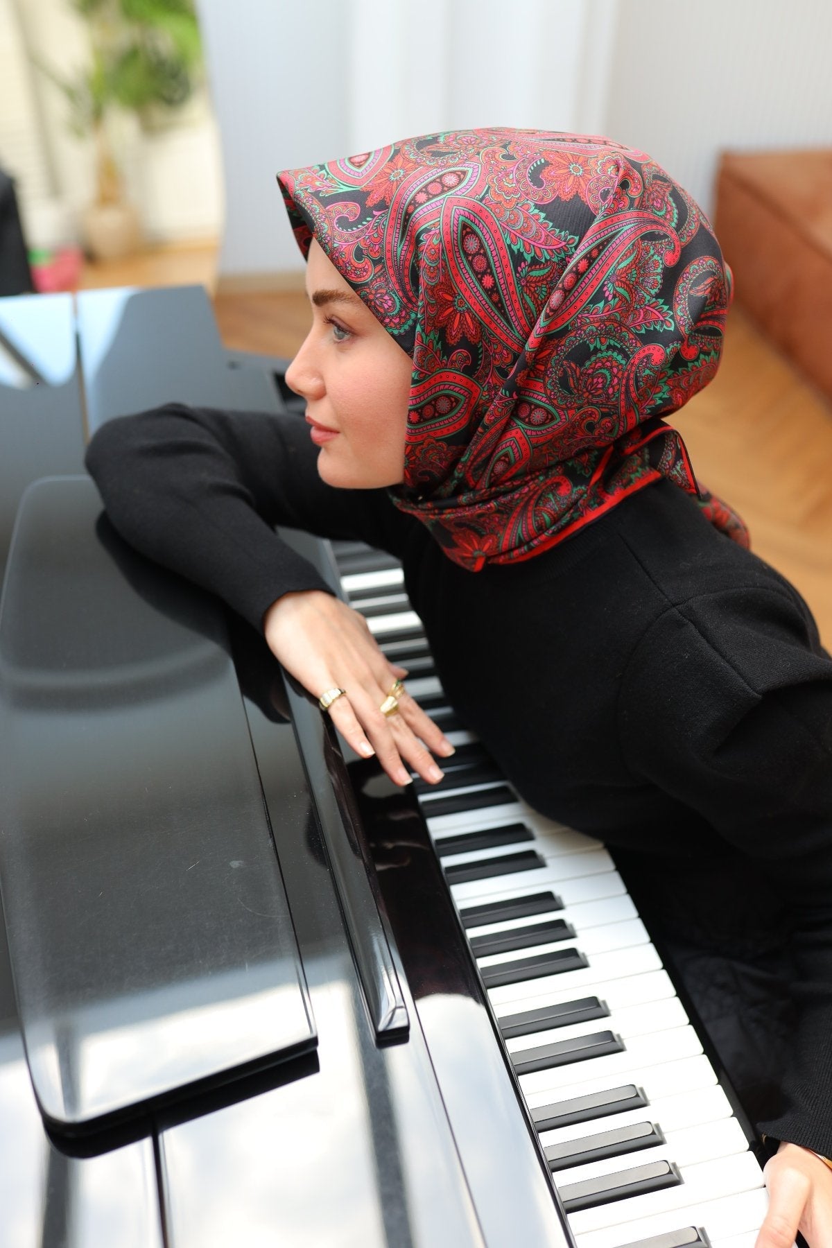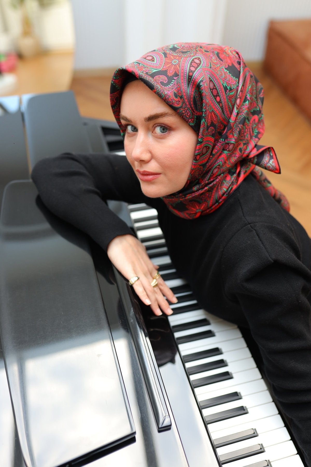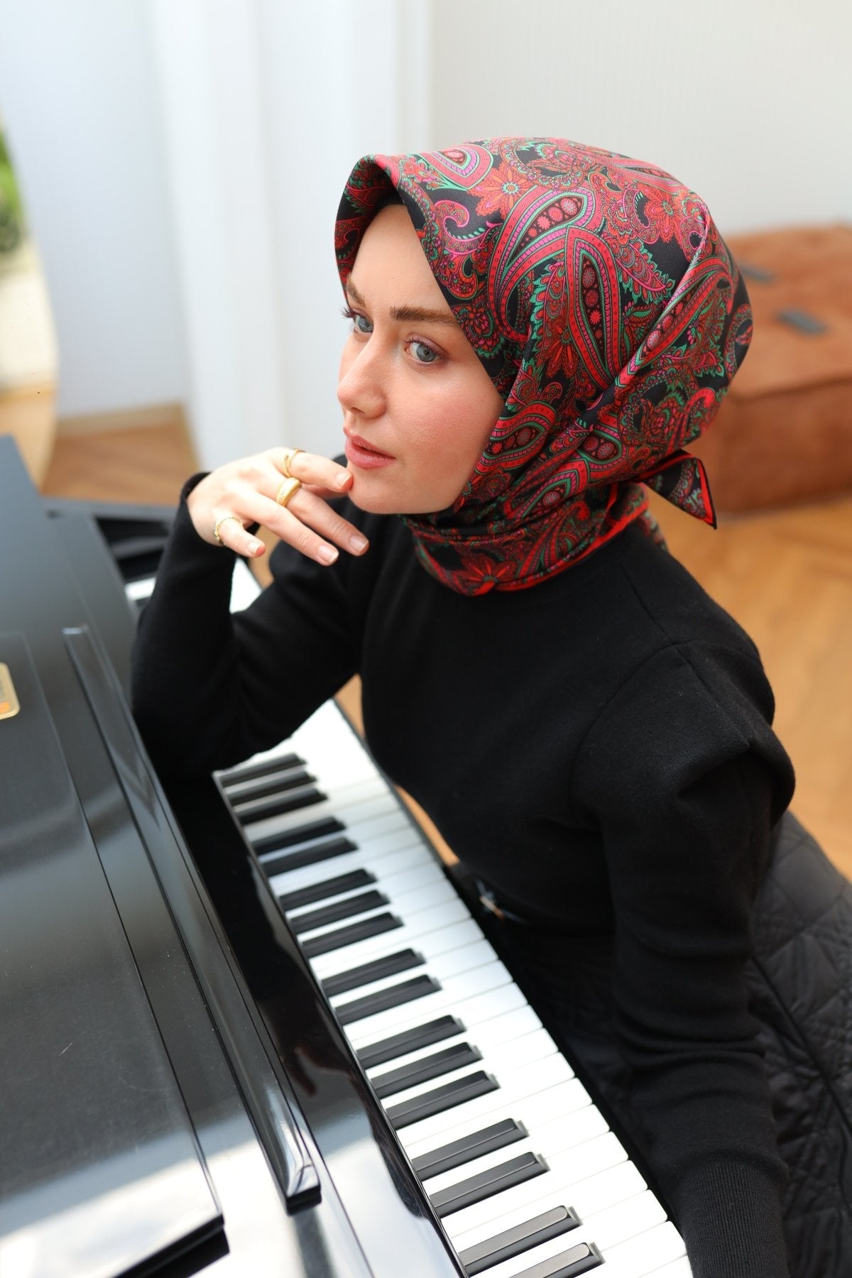 This twill silk scarf features layered paisley motifs enriched with micro floral and curve-line details. Its firm texture allows for perfect draping and long-lasting form throughout the day. Designed for women who seek vibrancy in a classic design.